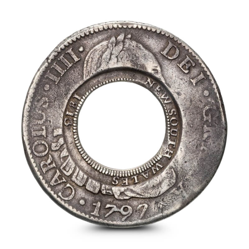 In 1812, NSW Governor Macquarie imported 40,000 Spanish silver coins from Mexico and had their centres punched out to ‘trademark’ them – effectively creating Australia’s first minted currency!