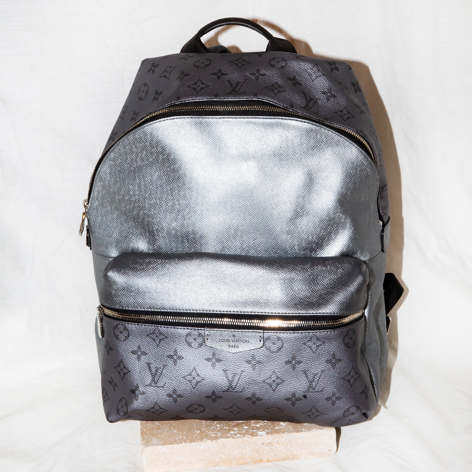Crafted from Louis Vuitton’s durable and distinctive Silver Taiga Leather, this Discovery Backpack is a unique, discontinued piece from the brand’s Men’s Spring/Summer 2019 Collection. Its sleek design and sought-after metallic finish make it a highly desirable item on the secondary market. Overall in very good condition, with isolated scuff marks on the bottom outside of the bag and minor staining on the inside of the bag.